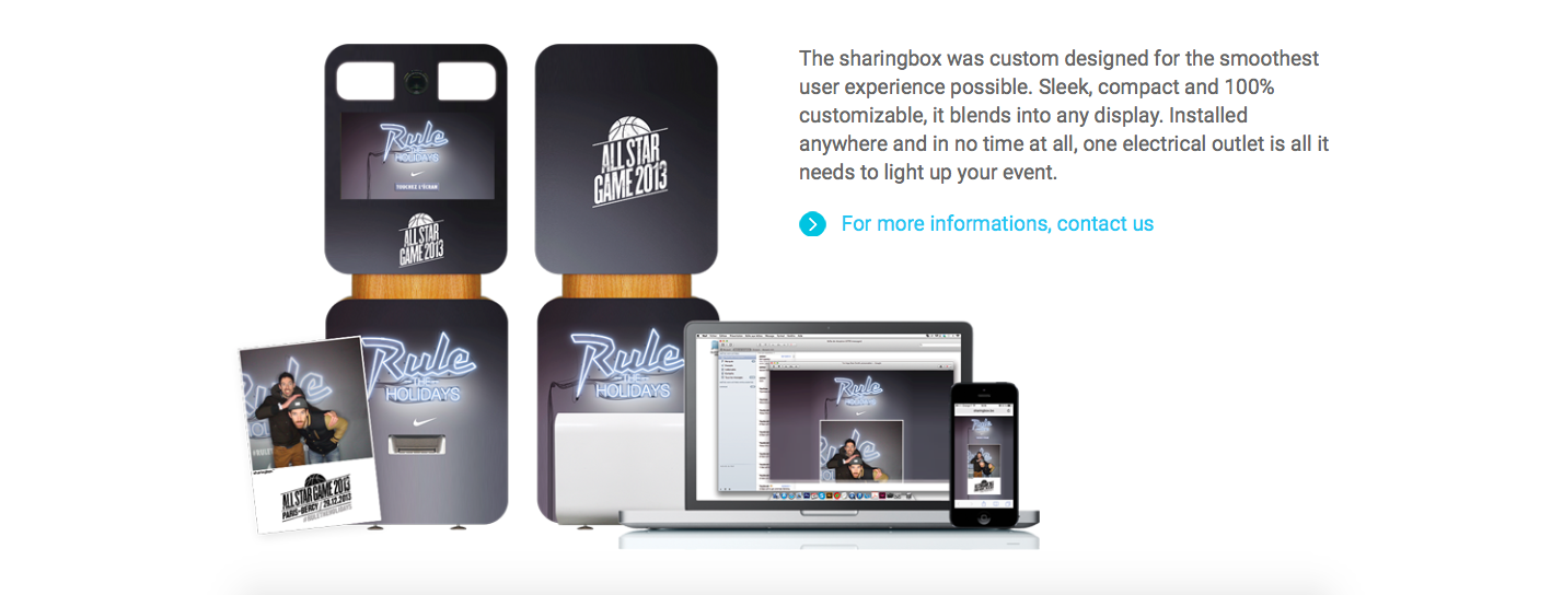 The sharingbox captures the imagination of your customers and gives you powerful insights to better understand them. A powerful marketing tool in disguise, discover what the 2.0 photobooth can do for you.